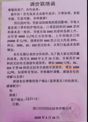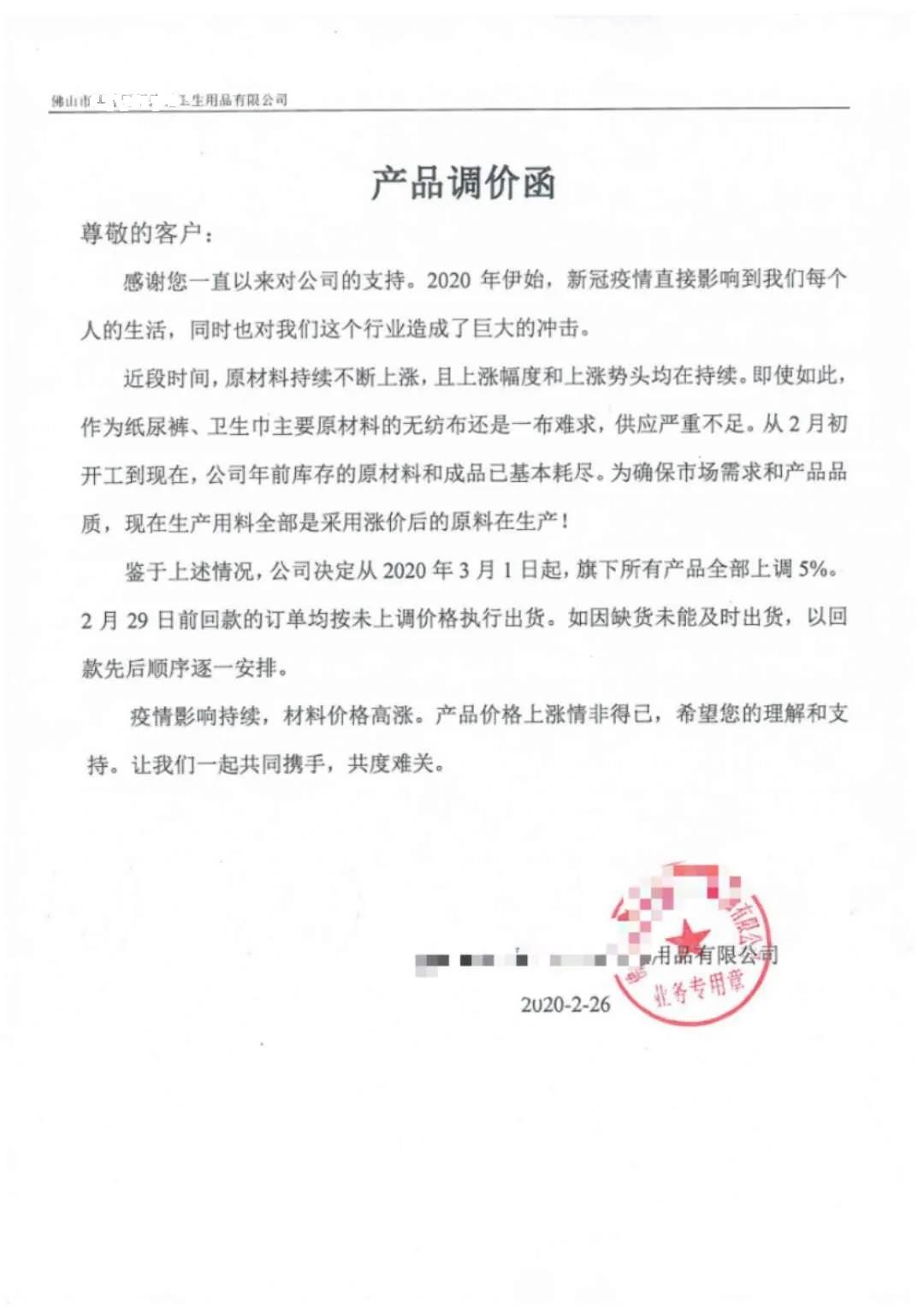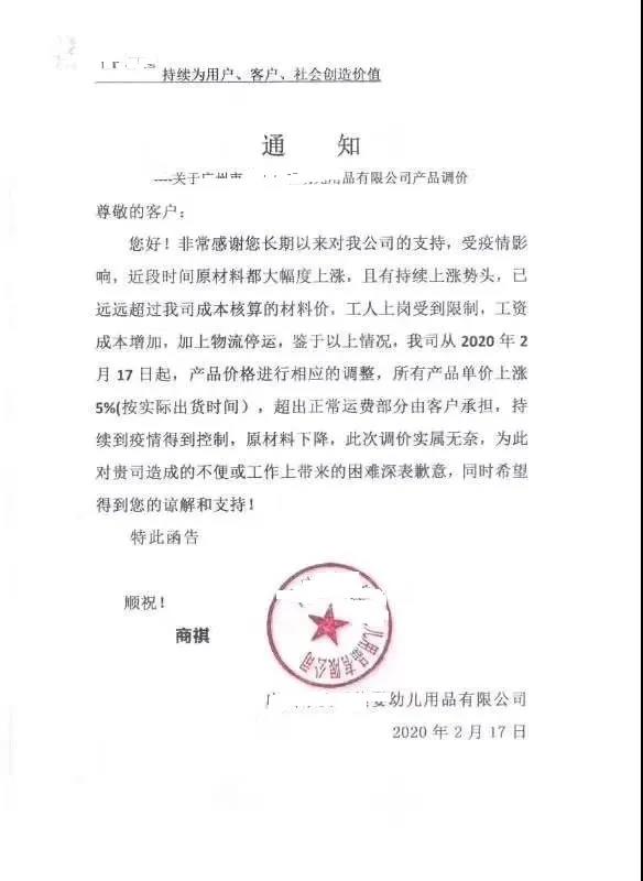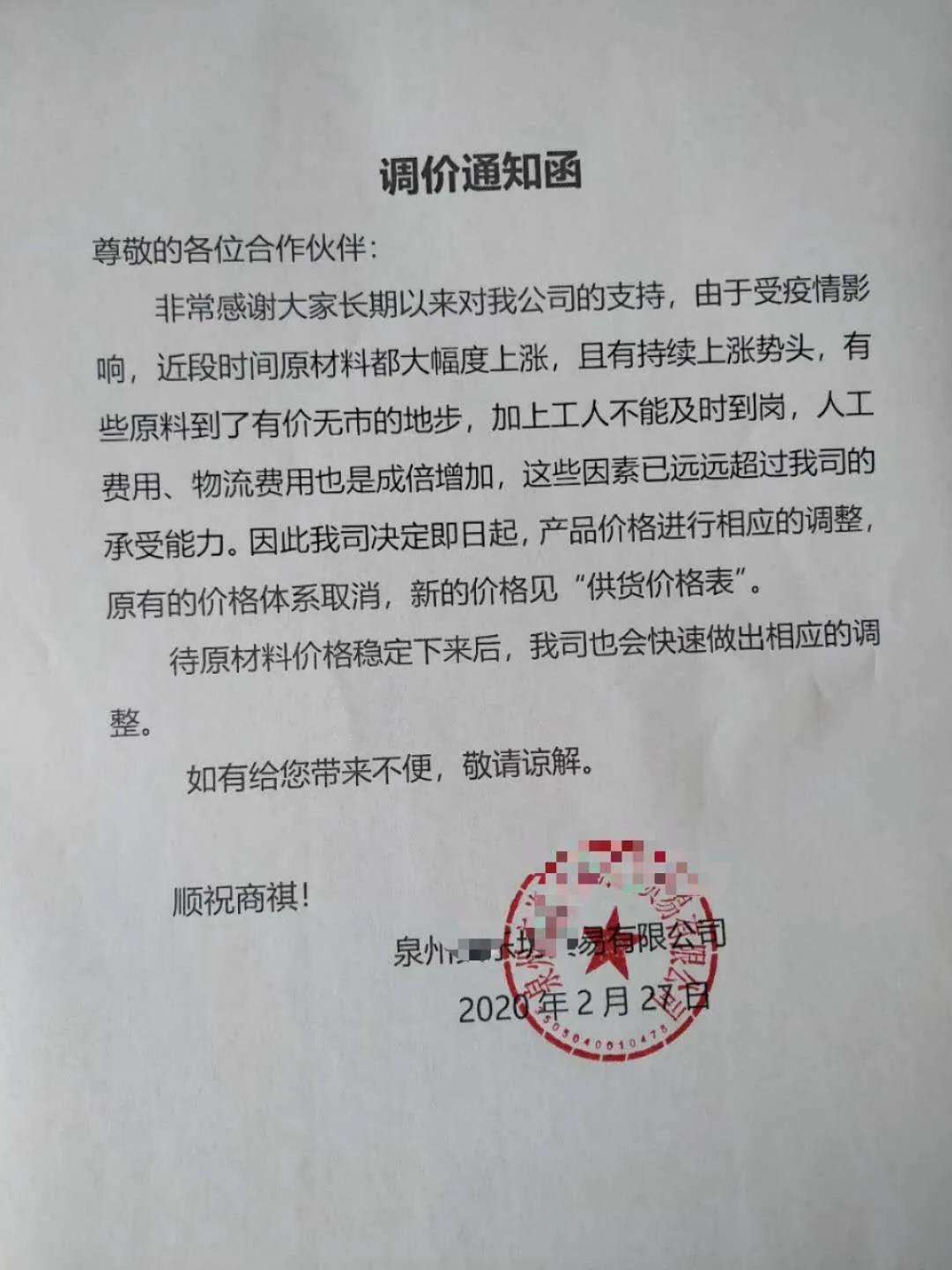 “3月1日起,旗下所有產(chǎn)品上調(diào)5%”,“產(chǎn)品價格進行相應(yīng)調(diào)整,原有的價格體系取消”。所有產(chǎn)品單價上漲5%,超出正常運費部分由客戶承擔(dān),持續(xù)到疫情得到控制,原材料下降”