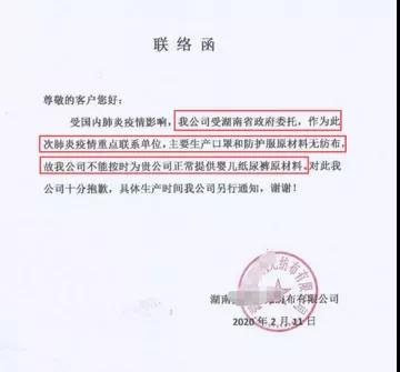“受政委委托,作為此次疫情重點聯(lián)系單位,主要生產(chǎn)口罩和防護服原材料無紡布,不能按時正常提供嬰兒紙尿褲原材料”