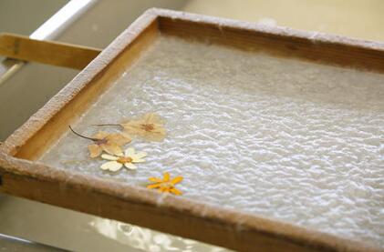 和紙由名為“流漉”的傳統(tǒng)技術(shù)制造而成。將名為“漉舟”的木箱泡在水槽里,通過前后左右不斷晃動(dòng)而制造出厚度均勻的紙。這種纖維復(fù)雜纏繞而成的和紙,無論是縱向還是橫向都不易破損,柔韌度高,薄而結(jié)實(shí)。