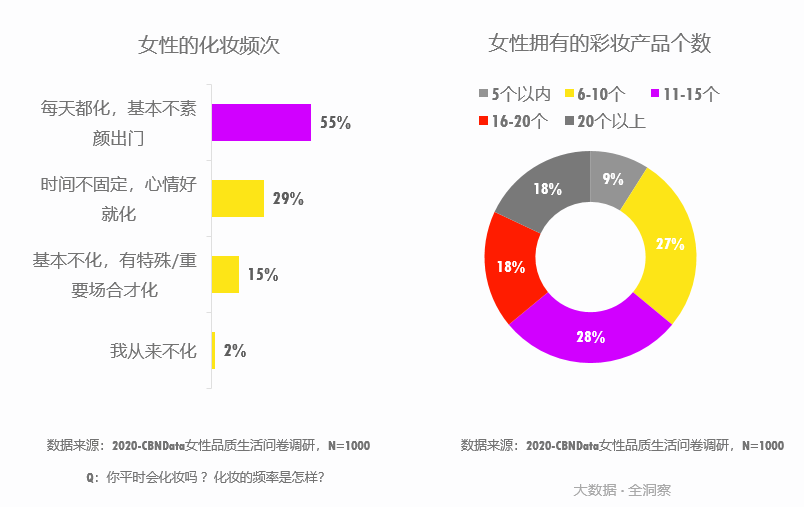 CBNData《報告》顯示,越來越多的女性開始關(guān)注對自己外在形象的話語權(quán),近年來彩妝消費需求強(qiáng)勁。55%的女性每天化妝,64%的女性擁有10件以上的化妝品。