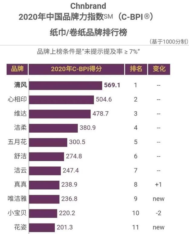 清風(fēng)能夠連續(xù)兩年榮獲“2020年C-BPI中國品牌榜紙巾/卷紙類第一品牌*”,同公司品牌真真和唯潔雅也成功躋身前十,這不僅證明產(chǎn)品品質(zhì)得到認可,更意味著品牌獲得廣大消費者的喜愛與支持。