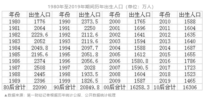 新生人口是母嬰行業(yè)基本盤中的基本盤。進(jìn)入21世紀(jì)以來,這二十年間總共有多少人出生?隨著出生率逐年下降,00后和10后,相比80后和90后,究竟少了多少人?近日,第一財經(jīng)根據(jù)歷年統(tǒng)計公報、公開數(shù)據(jù)統(tǒng)計梳理發(fā)現(xiàn),我國80后、90后、00后、10后人數(shù)分別為2.21億、2.08億、1.63億(16258萬)、1.63億(16306萬)。