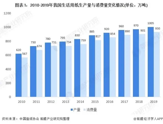 根據(jù)中國造紙協(xié)會在歷年《造紙工業(yè)年度報告》中披露的數(shù)據(jù),2010-2019年我國生活用紙的生產(chǎn)量與消費量整體上呈現(xiàn)逐年增長的態(tài)勢。2019年,我國生活用紙產(chǎn)量為1005萬噸,較2018年增長3.61%;消費量為930萬噸,較2018年增長3.22%。