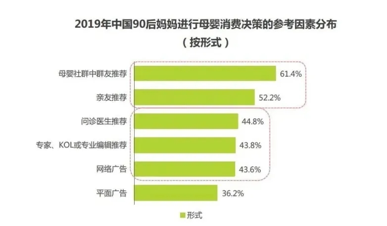在認(rèn)知-消費(fèi)-決策的思考環(huán)節(jié)中,65.3%的90后小城新媽信賴專業(yè)人士背書,會(huì)受到專家、KOL、專業(yè)編輯等知識(shí)型內(nèi)容推薦吸引而進(jìn)行購買