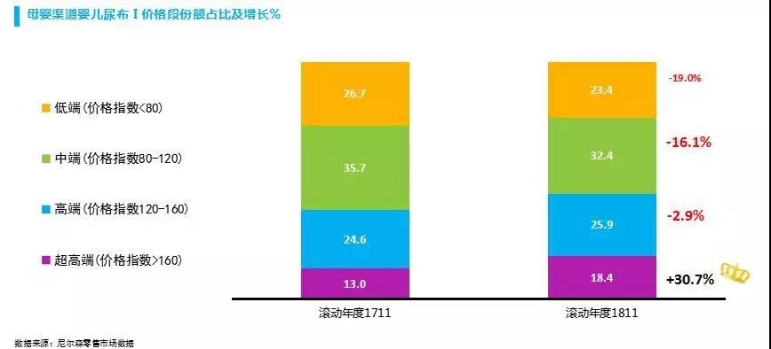 以嬰兒洗護(hù)領(lǐng)域?yàn)槔?018年高端和中高端產(chǎn)品可占到全渠道近50%的比重,產(chǎn)品顏值化、消費(fèi)輕奢華、品牌國際化成為趨勢(shì),如高端品牌艾惟諾2018年線上增幅高達(dá)116%,可見一斑。
