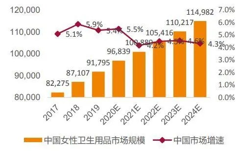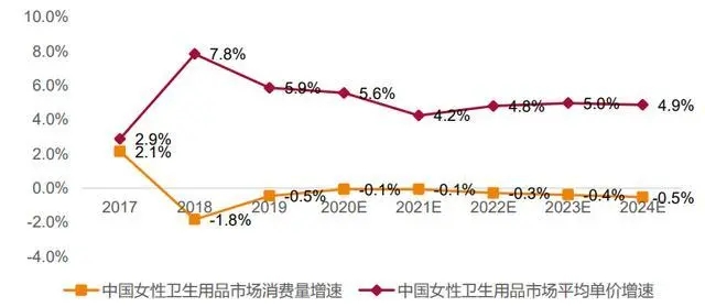 2017-2024年中國(guó)女性衛(wèi)生用品市場(chǎng)規(guī)模量?jī)r(jià)拆分