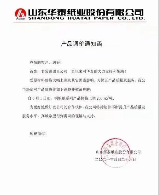 世紀(jì)弘博:即日起對(duì)我司經(jīng)營(yíng)的白卡紙、銅版卡紙系列產(chǎn)品提價(jià)500元/噸。后續(xù)在5月10日起,再次上調(diào)500元/噸。