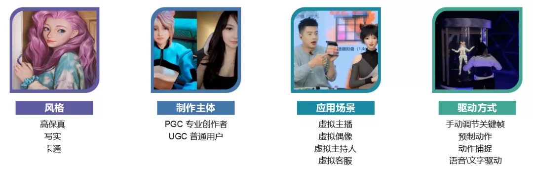 對于虛擬人的技術分類,我們可以從風格、創(chuàng)作主體、應用場景、驅(qū)動方式幾個方面進行了解: