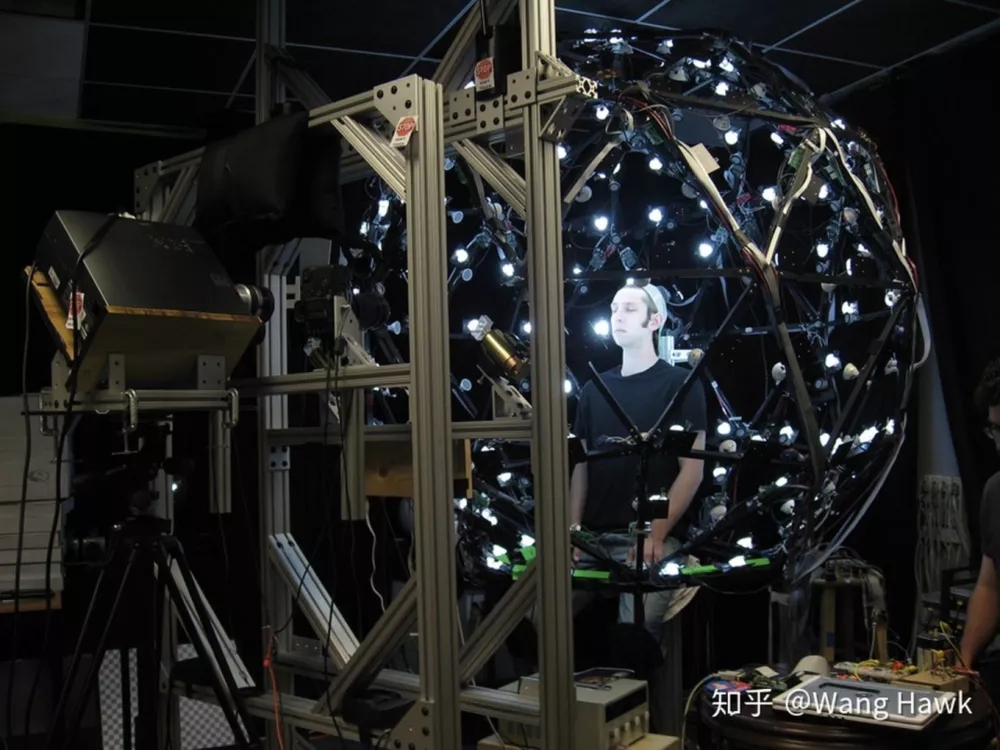 Light stage技術正是通過構(gòu)造相機陣列,以多角度、高精度照片,既還原拍攝人物的三維結(jié)構(gòu),也獲取面部的反射信息,從而能在不同環(huán)境光下重構(gòu)人臉模型光效。