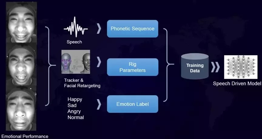 為此,團隊建立了一套精確的面部動捕流程,以不同情感下的動作捕捉,來訓練語音驅(qū)動模型,最終構(gòu)造了一個長約20個小時、13339條語句的,包含語音、面部運動和身體運動的多模態(tài)訓練數(shù)據(jù)集。在Siren AI 基礎上,增加情感維度數(shù)據(jù),讓Matt擁有微笑、蹙眉等微表情,多了更自然的“人情味”。