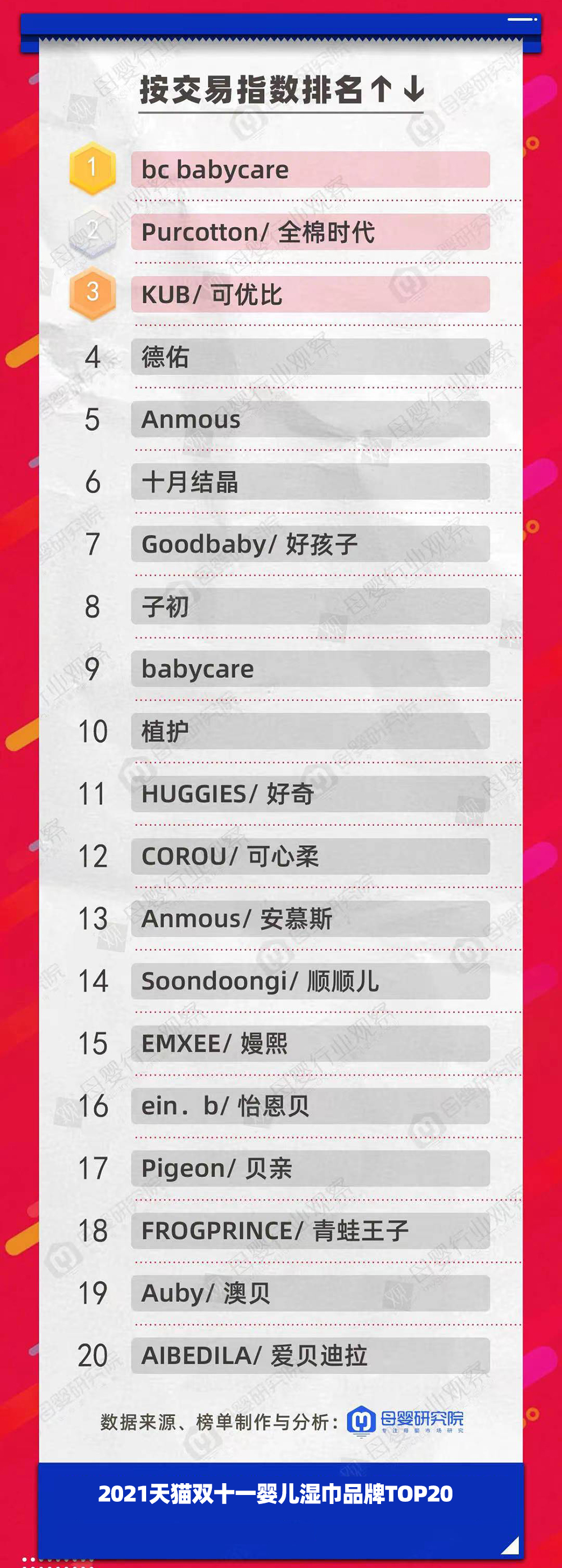 嬰兒濕巾品類當(dāng)中,babycare、Purcotton全棉時代以及KUB可優(yōu)比占據(jù)了頭三把交椅。去年雙11排名前三的是BABYCARE BY PHILEMON、Purcotton全棉時代和Goodbaby好孩子。