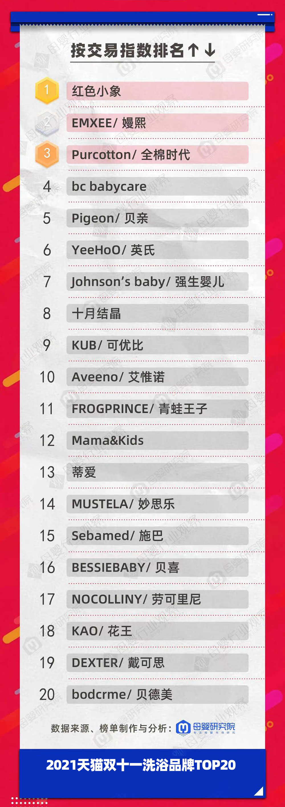 紅色小象、EMXEE嫚熙和Purcotton全棉時代優(yōu)異地拿下了本次雙11寶寶洗浴品牌的前三。而2020年雙11時,位居前三的是紅色小象、Purcotton全棉時代和蒂愛。
