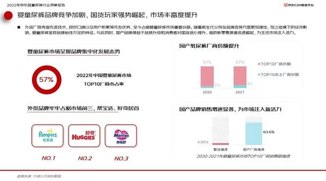 面對市場空間的變化,國內(nèi)嬰童尿褲品牌競爭加劇。其中外資廠商憑借先進技術、良好口碑以及用戶積累等先發(fā)優(yōu)勢,至今占據(jù)嬰童尿褲市場重要份額。而一方面,隨者新生代父母在品牌選擇方面更加理性,加之疫情下的經(jīng)濟影響,嬰單尿褲也呈現(xiàn)出品牌粘性不足的特征。與此同時,得益于品質升級和消費者對國貨信心的提升,國貨品牌借助新零售渠道迅速崛起,為主流市場注入活力。報告顯示,本土頭部廠商份額從2020年的5%迅速提升至2021年的8%,而國產(chǎn)廠商銷售額年增速則達到63.6%,遠超行業(yè)整體增速的4.9%。