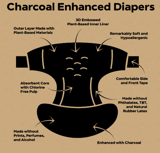 Dyper 推出了木炭增強(qiáng)紙尿褲,其黑色頂片注入了 3% 的竹炭,竹炭以其過濾和除臭特性而聞名。